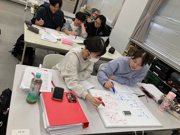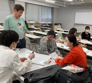 この科目は、2月に行われる作業療法士の国家試験に向けた学習を行います。10月は、ヒトの体のしくみ・働きを理解するために解剖学・生理学の復習を行っています。学習は、「講義を聞く」→「わからないことを自分で調べる」→「わかったことを人に説明する」の順番でより成果が上がることがわかっています。ですので、この科目では「調べたことを友達に教えてあげる」グループ学習を取り入れています。