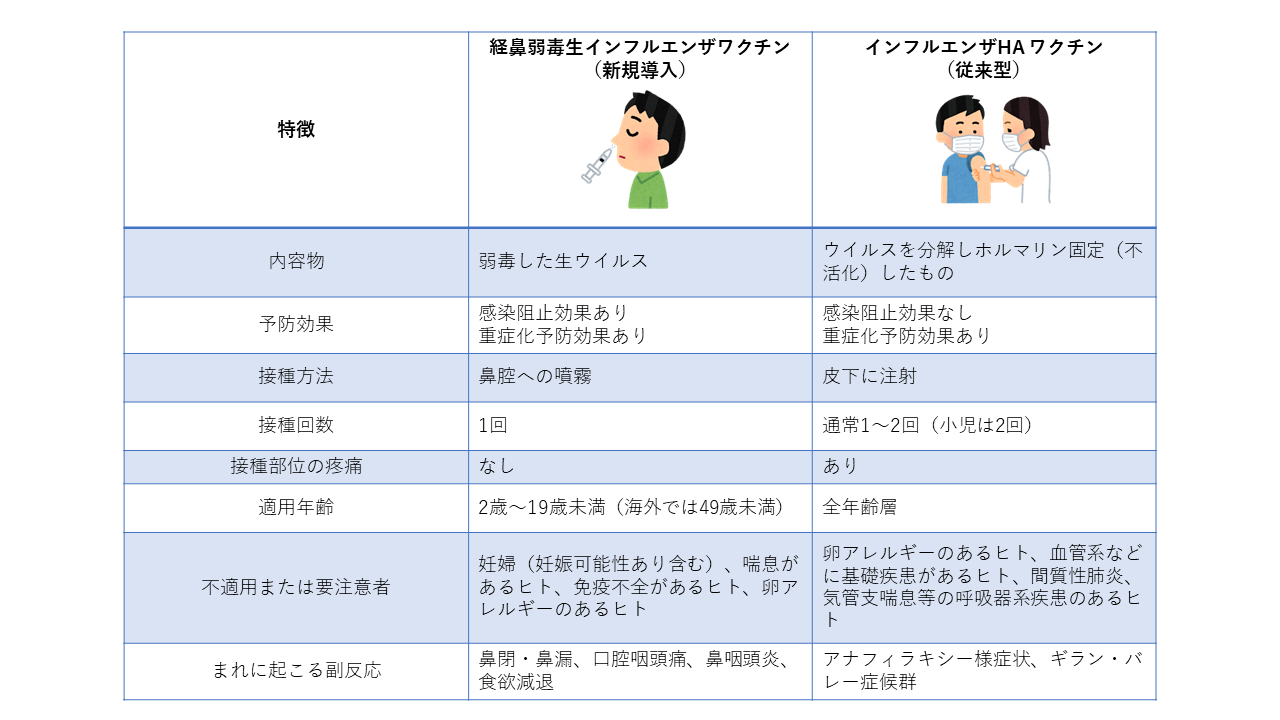 下記に従来型の注射ワクチンと対比させてメリット、デメリットを表にまとめましたので、インフルエンザワクチンの選択に際して参考にしていただければと思います。