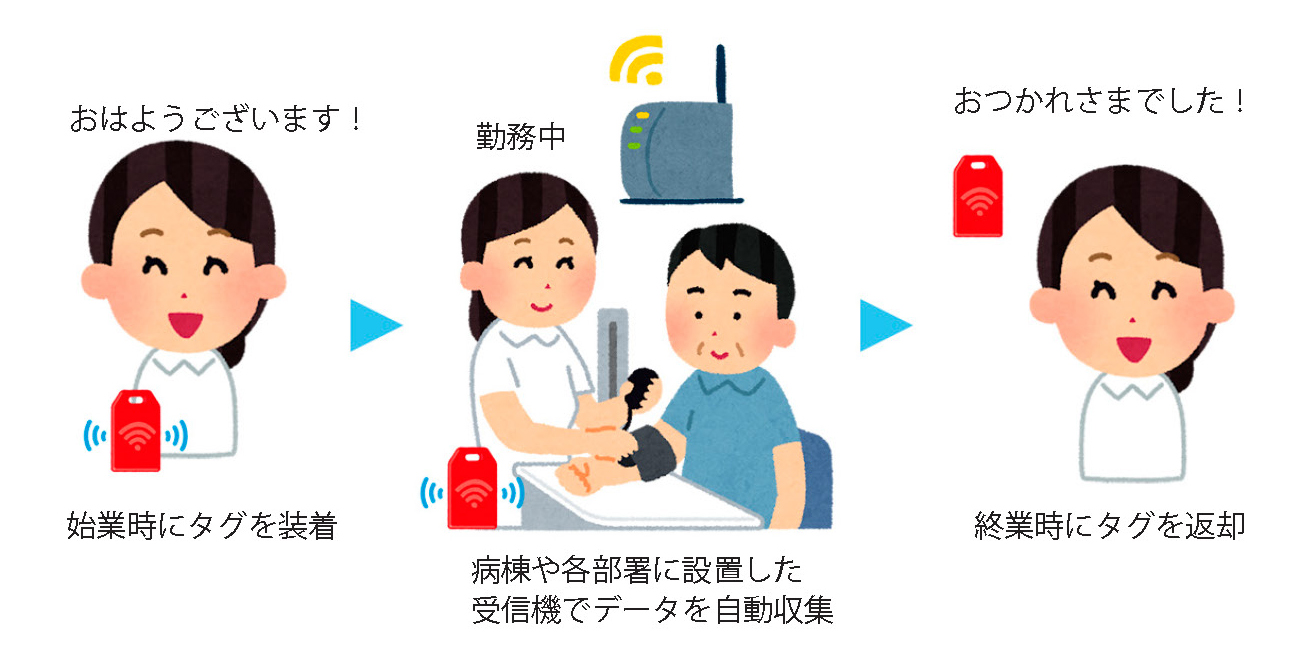 そこで、業務をより簡便に可視化する方法として、位置情報と滞在時間を把握できる位置電流検知システムを活用し、実際の臨床現場で実証実験を行いました。この調査は、文部科学省の科学研究費補助金・基盤研究(C)「��務改善・業務の効率化を目指した業務量調査・分析の自動化に関する研究」として採択されました。