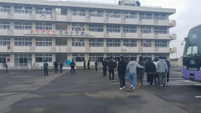 震災遺構仙台市立荒浜小学校では、壁に残る波の跡、津波で曲がった鉄の手すりなど、津波の痕跡を見て、その威力に圧倒されました。当時のことを語る映像で防災の大切さを実感しました。