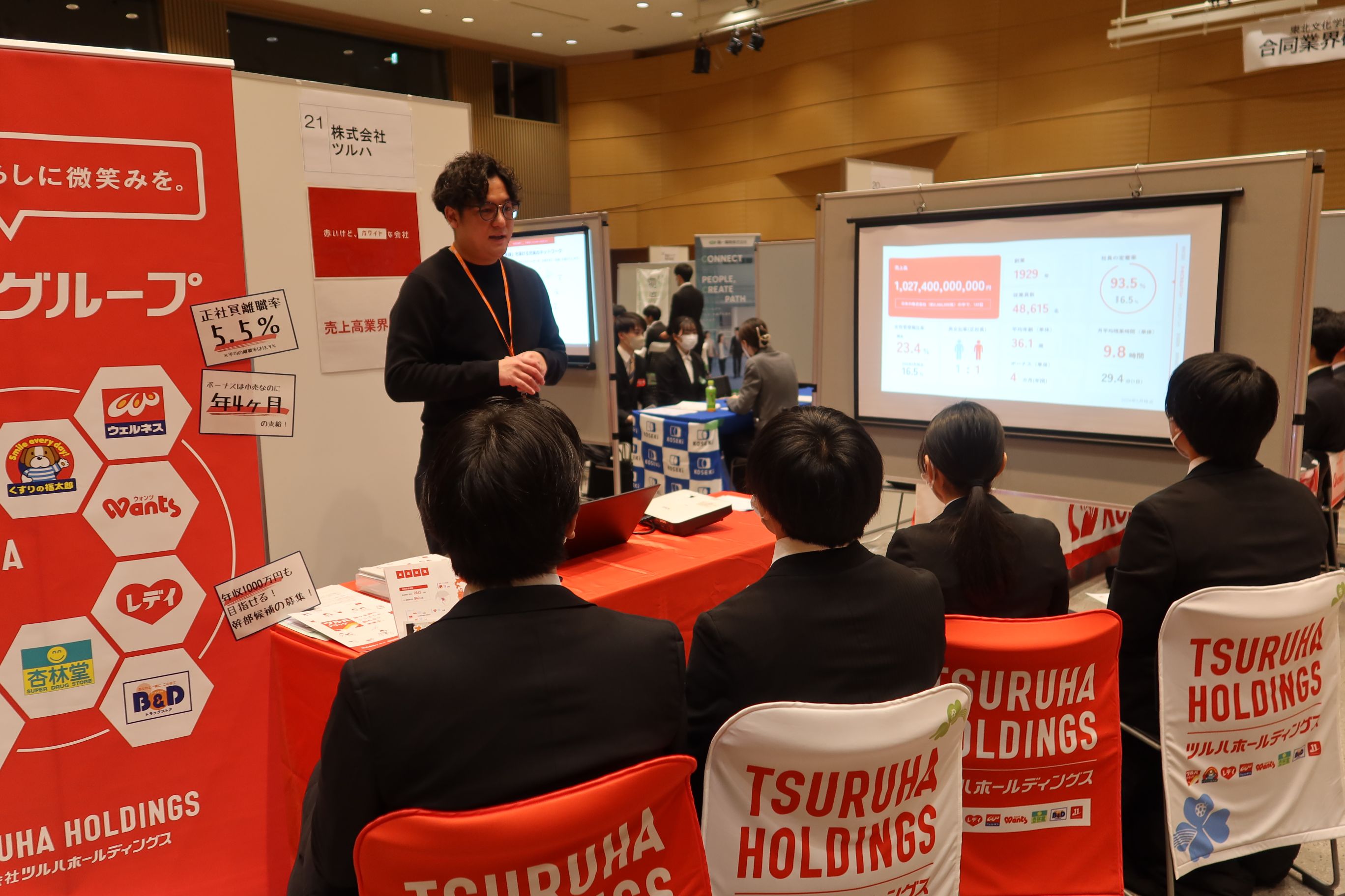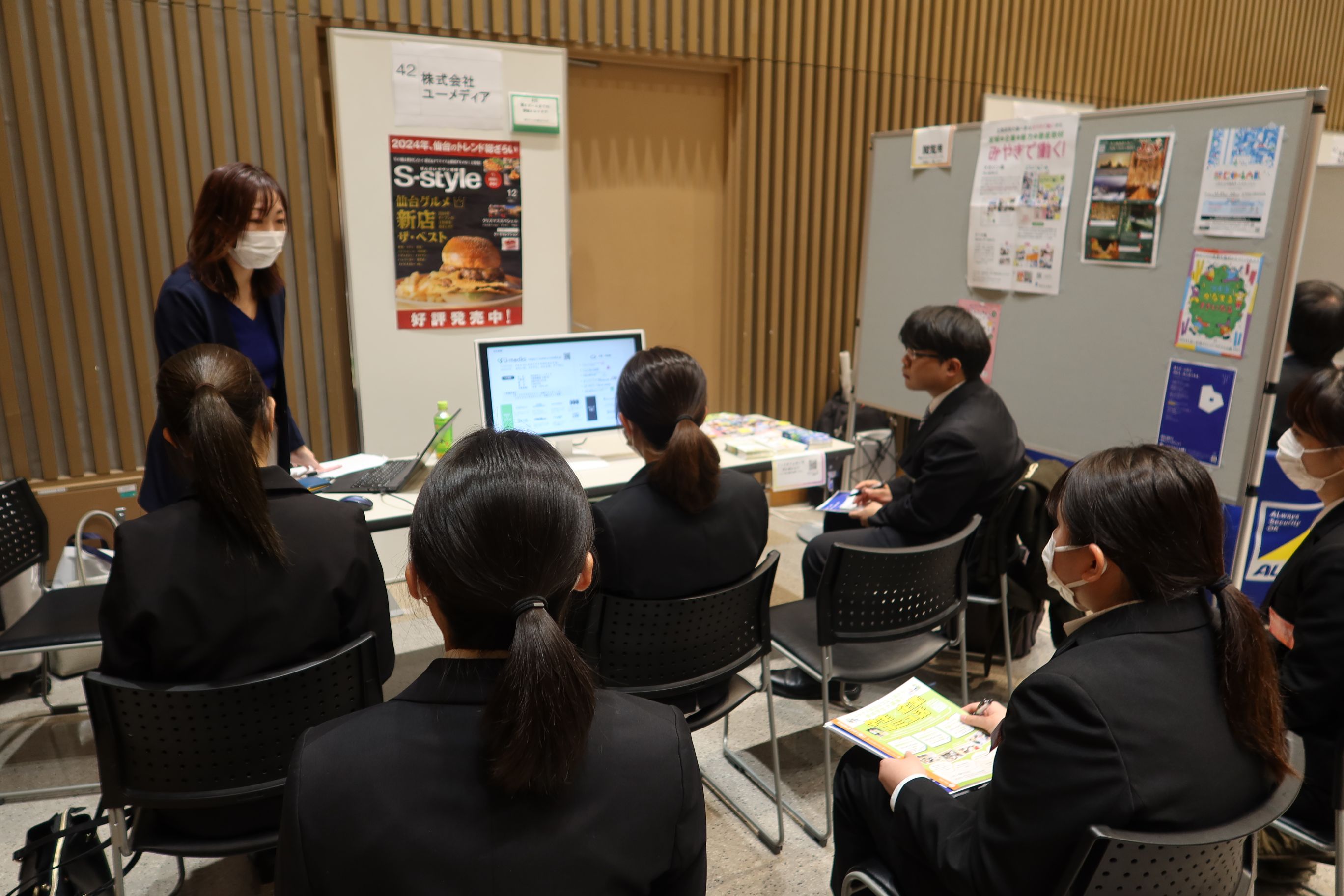 合同業界研究会は昨年度から学外会場(AER)にて対面形式とし、現代社会学科、経営法学科、知能情報システム学科の3学科合同で開催しています。当日はIT系企業や福祉事業所、ものづくり企業も含めた幅広い業種の42社の事業所にご参加いただき、約165名の学生が参加しました。学生達は各社の説明に真剣に耳を傾ける様子が見られ��した。アンケートからは「知らないことを多く知ることができる非常に有意義なイベントだった」「新たに興味を持った企業を見つけることが出来た」との感想が聞かれ、業界企業選びの視野を広げる機会になったようです。