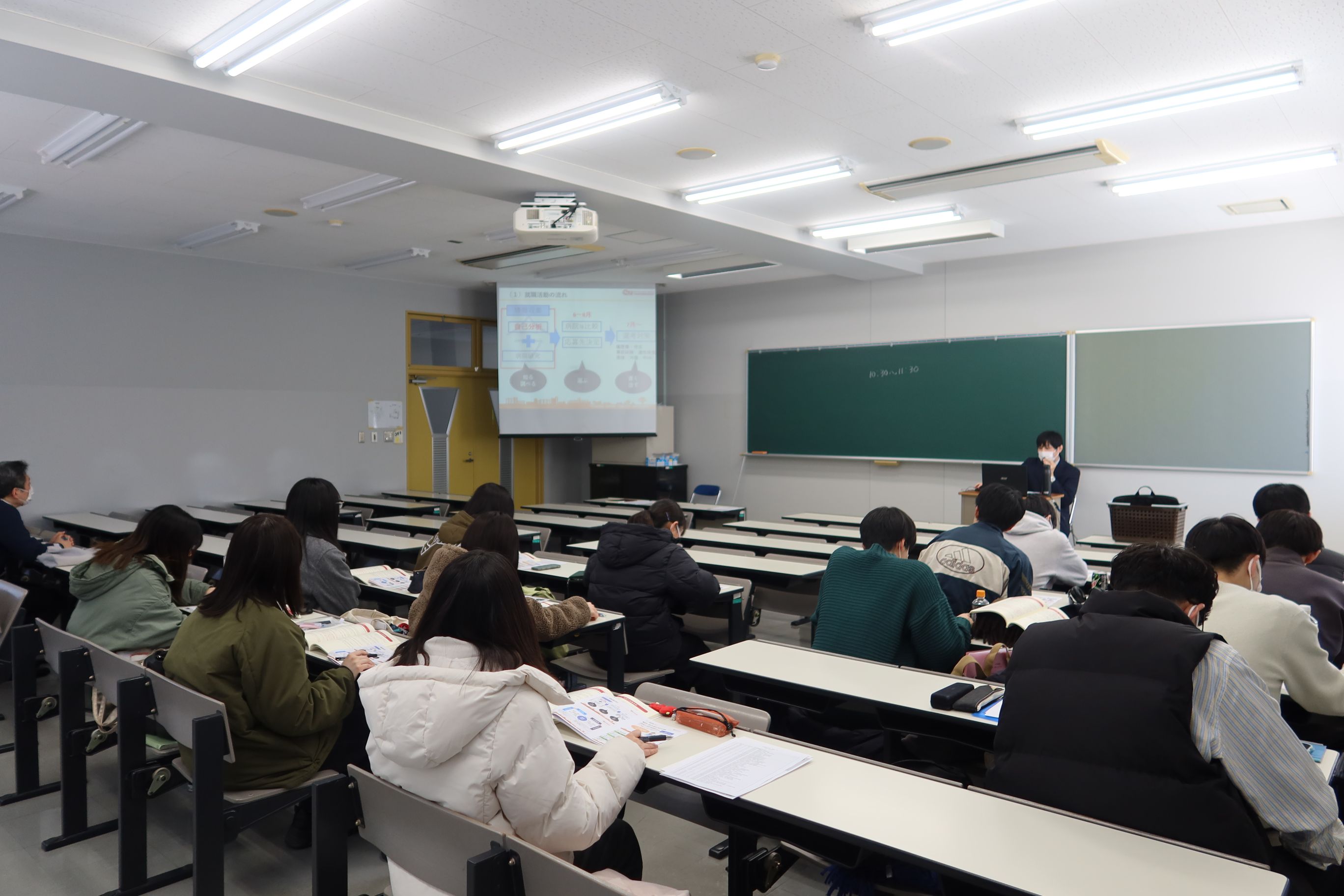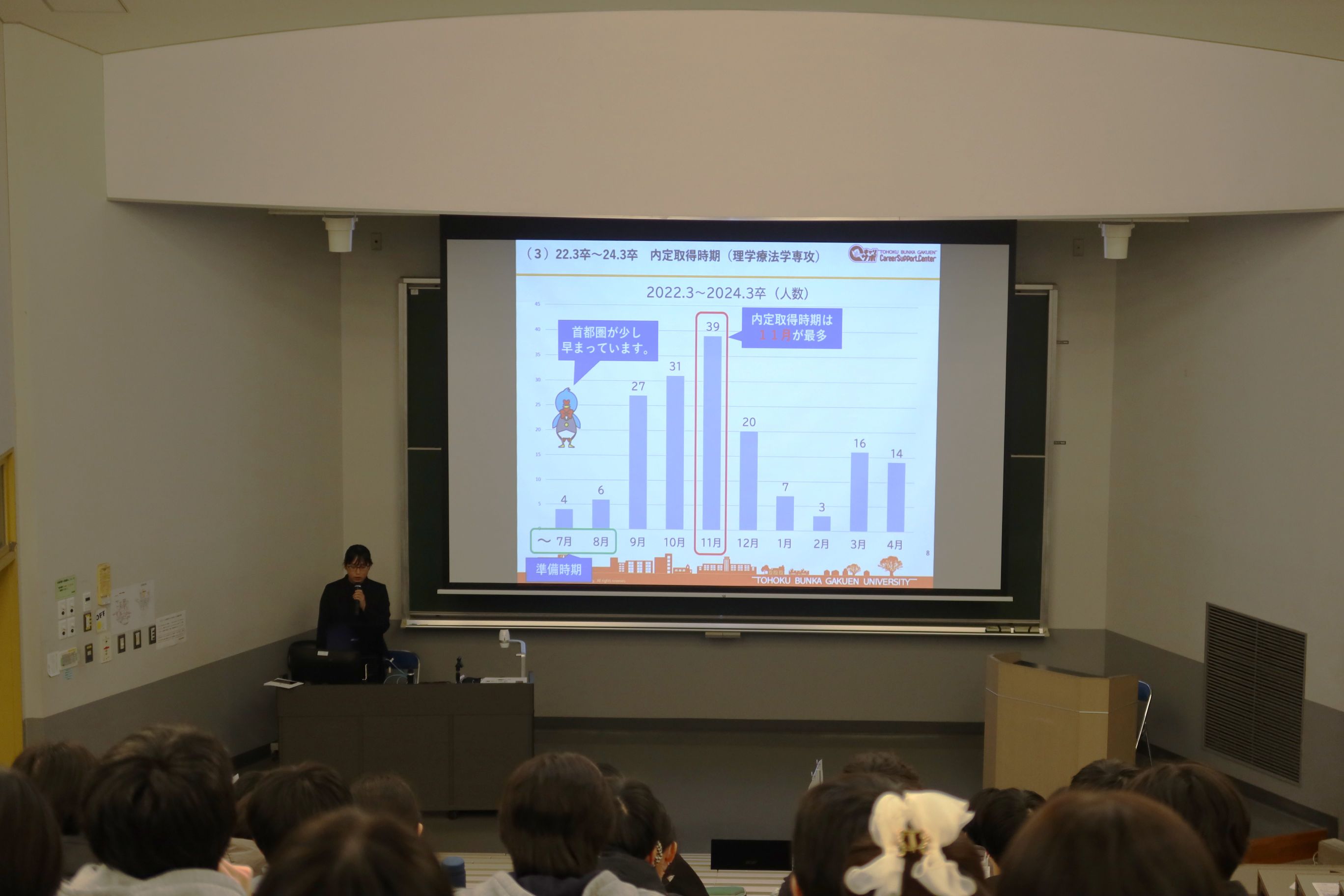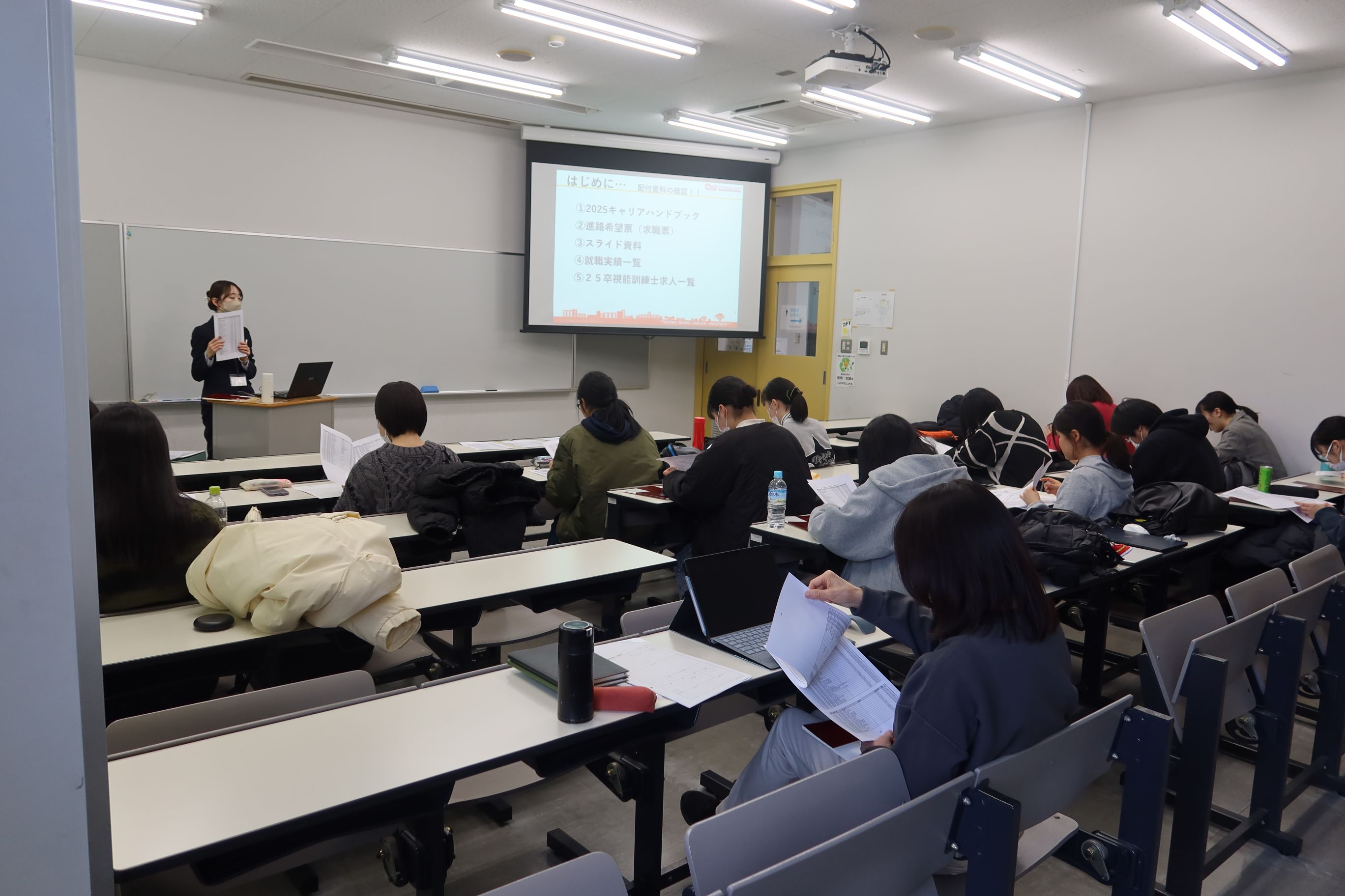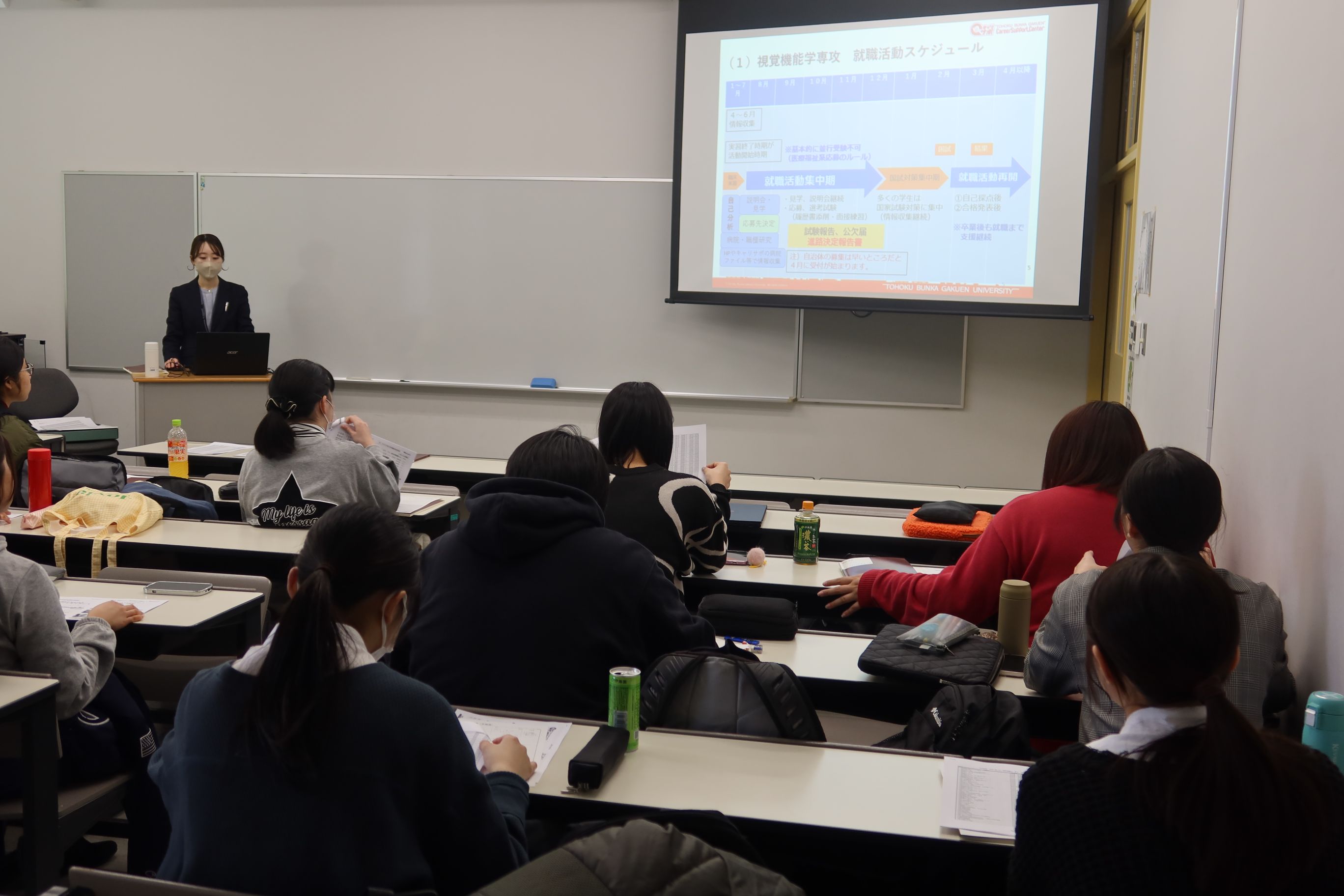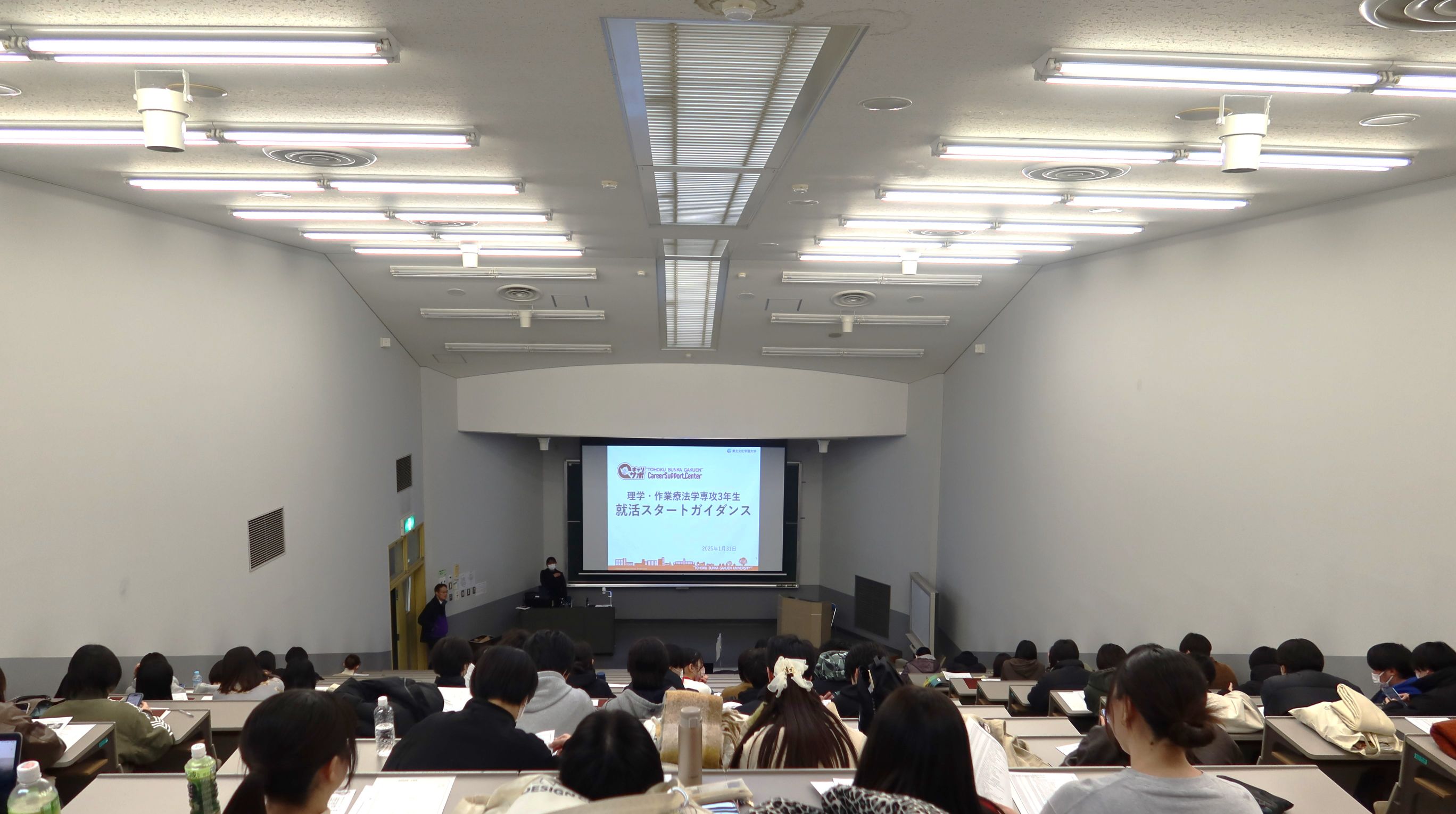2025年1月から2月にかけて、医療福祉学部リハビリテーション学科3年生を対象とする「医療系就活ガイダンス」を各専攻別に実施しました。当該専攻の学生は4年生へ進級後、学内の講義・演習、臨床・臨地実習、卒論の作成・発表、国家試験受験対策などと並行して就職活動を進めることとなります。そのような忙しい授業日程の合間を縫ってどのように就職活動を進めるべきか、各専攻の授業スケジュールや各職種における求人の特徴などを踏まえて説明をいたしました。