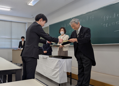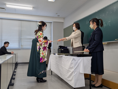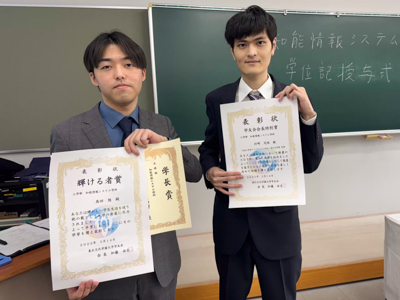 後半は各学科別の授与式となり、知能情報システム学科では卒業生一人ひとりに学位記が手渡されました。学科長は卒業生に向けて、老子の言葉「千里の道も一歩より」を贈り、新たな旅立ちを祝福しました。