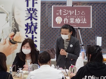 午後からの特別企画では、「おしゃれと作業療法」というテーマのもと、片手で出来る化粧体験を行いました。