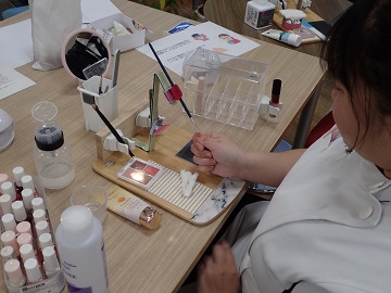 化粧は自己表現をしたり、自分を引き立てたりします。また、化粧が礼儀とされることもあり、ニーズも高い作業となっています。私たちは普段何気なく両手で行っている作業ですが、様々な工夫することで片手でもできることを実感してもらいました。