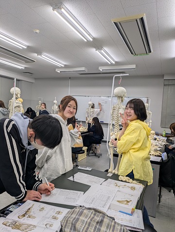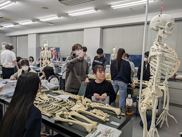 4月10日から前期の授業が始まり、1年生は早速「解剖学」について学びました。「解剖学」は医学分野の職種を目指す者にとって共通の知識となる、とても重要な科目です。けれども、新しく専門用語を次々覚えていかなくてはならないので、難しいと感じる学生も多いです。解剖学実習では、上級生の支援学生が複数参加していて、個々の学生の疑問への回答や勉強のコツを優しく教えてくれます。