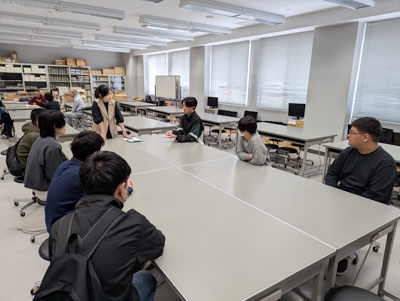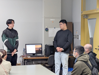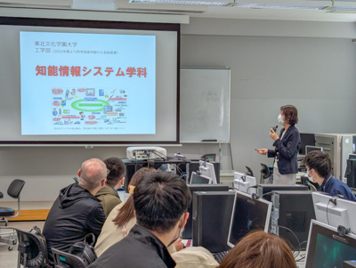 知能情報システム学科のプログラムでは、冒頭に沈学科長より学科の概要と各種入試方式についての説明がありました。続いて行われた学科施設見学・体験学習では、3つの実験室と費准教授の研究室を紹介しました。