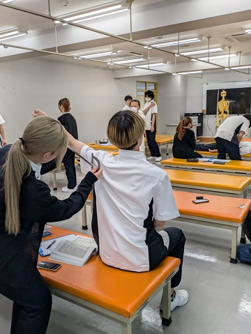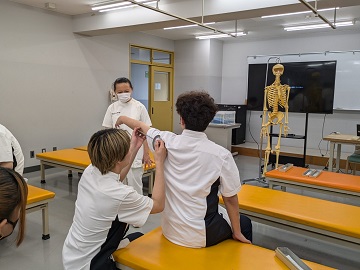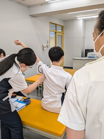 この日は、脳卒中により片麻痺を呈した患者さんの設定で、肩の関節可動域を検査する実習を行いました。最初に見本となる動画を見学し、動画の中で説明された注意点が、なぜ必要なのかをグループで話し合ってから実技練習を行いました。