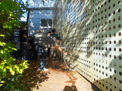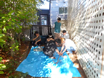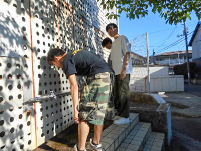 吐水ユニットが完成したら、受水槽囲いフェンスにセット、受水槽と連結すると、蛇口からは問題なく新鮮な水が吐出され、学生達は思わず感激の様子でした。この活動は今後も継続して行う予定です。