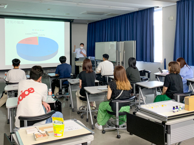 模擬授業では、「爽やかな室内空気をつくるための考え方」と題して体験授業を行い、参加学生が芳香剤をつくりました。