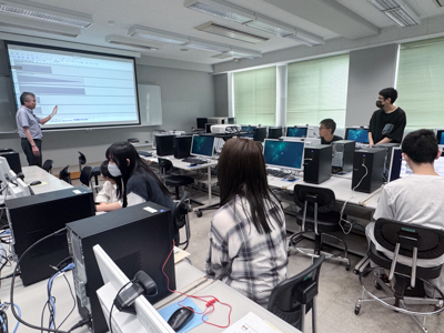 オープンキャンパスは、学科紹介、施設見学体験、模擬授業、在校生とのフリートークなど多彩なプログラムを通じて来場者の方々にとって有意義な時間となりました。模擬授業は、音の合成、チャットプログラムによるネットワーク体験、ARゲーム制作などのトピックを通じて、本学科の学びを体験していただきました。最後のフリートークでは、在校生を交えて入試体験談や学びの魅力、就職活動について、和やかな意見交換が行われました。このような交流によって、参加者の皆様の本学科の学びへの理解が深められ、関心を持っていただけたことを願っています。
