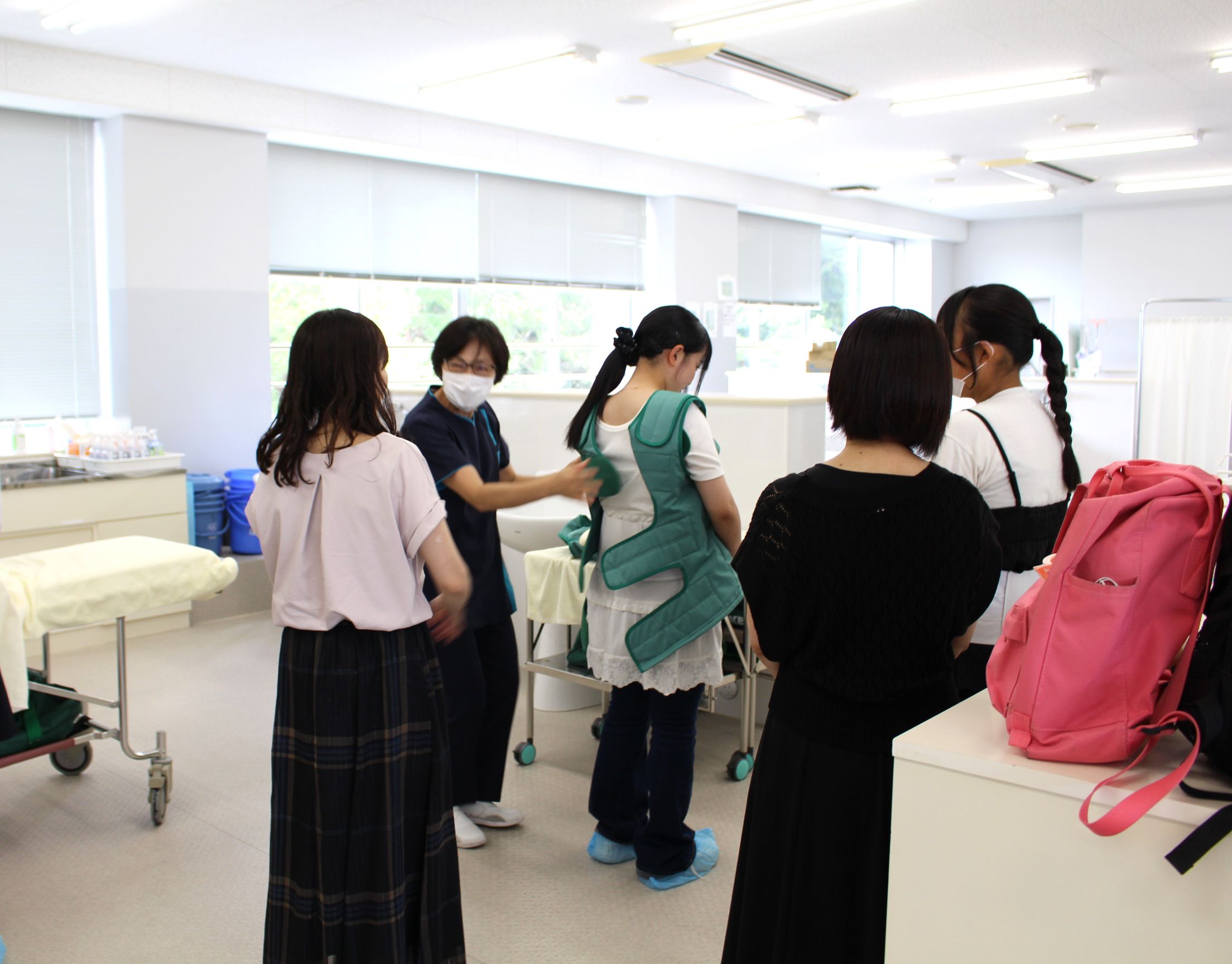 午前の部では、赤ちゃんの抱っこやおむつ交換、妊婦体験、シミュレーターを用いた状態観察、