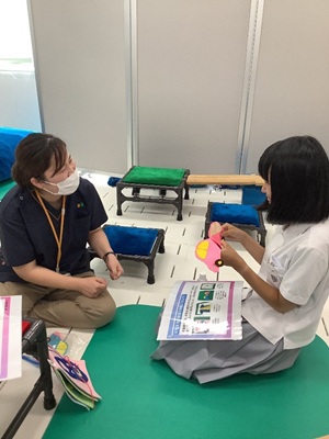 作業療法のリアルを体感できる体験コーナーでは、実際の実習室を見学しながら、