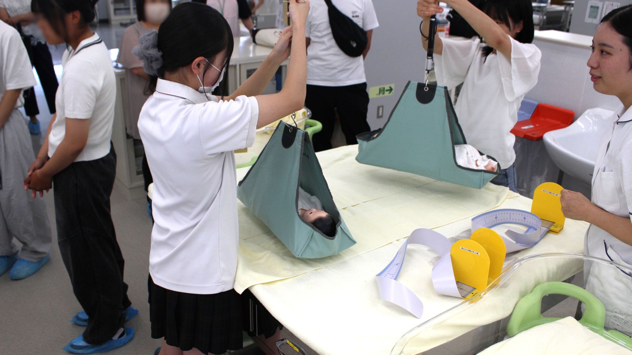 午前の部では、赤ちゃんの身長体重測定・抱っこ体験、吸引体験、