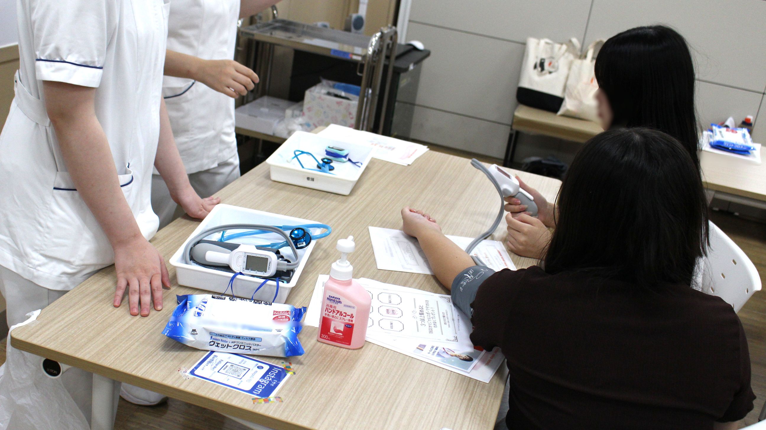 看護学科では、血圧などのバイタルサイン測定に挑戦していただきました。