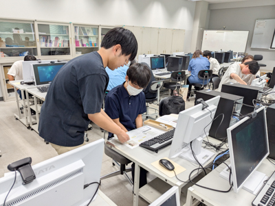 それぞれの開催日に、異なる模擬授業を行いました。8月3日の模擬授業では、マイコンを使ってLEDを点滅させる電子回路を作り、制御のしくみを楽しく学びました。8月24日の模擬授業では、プログラミングを通して画像圧縮の基本を体験し、その技術が社会でどのように活用されているかを知りました。