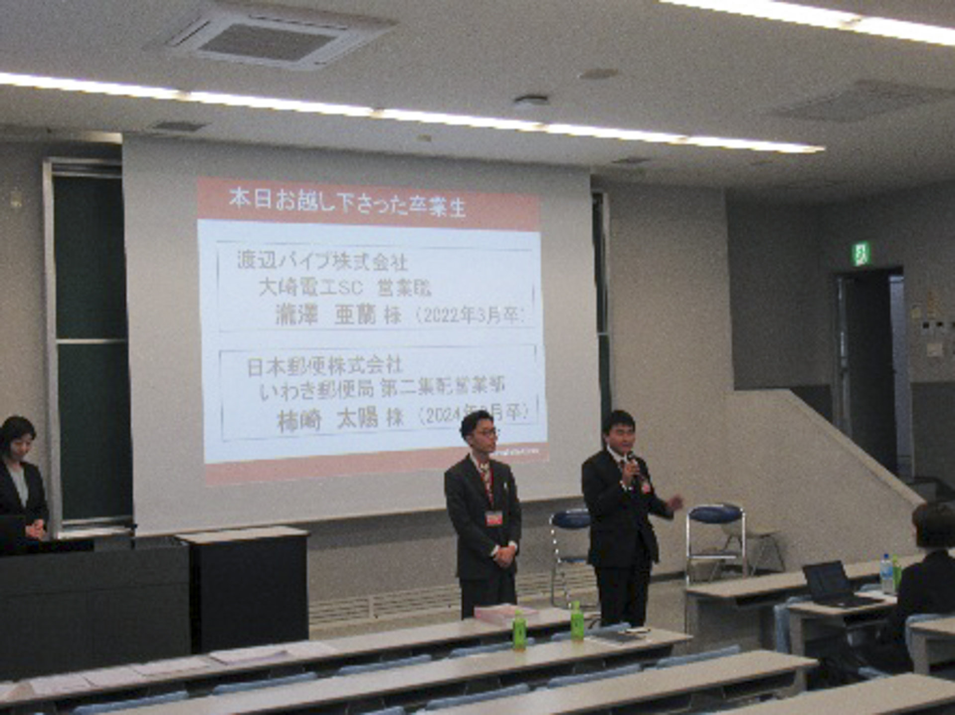 10月15日(水)のキャリア戦略Ⅳ(3年生対象)において、「卒業生が語る業界研究」を開催しました。当日は、2名の卒業生(所属先企業名:渡辺パイプ株式会社・日本郵便株式会社)をお招きし、入社後から現在に至るまで、就職活動の体験談、学生時代に行っておくべきことなどをテーマにお話を伺いました。