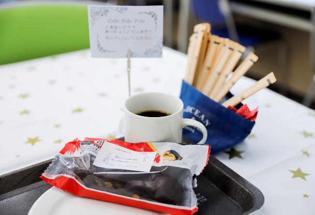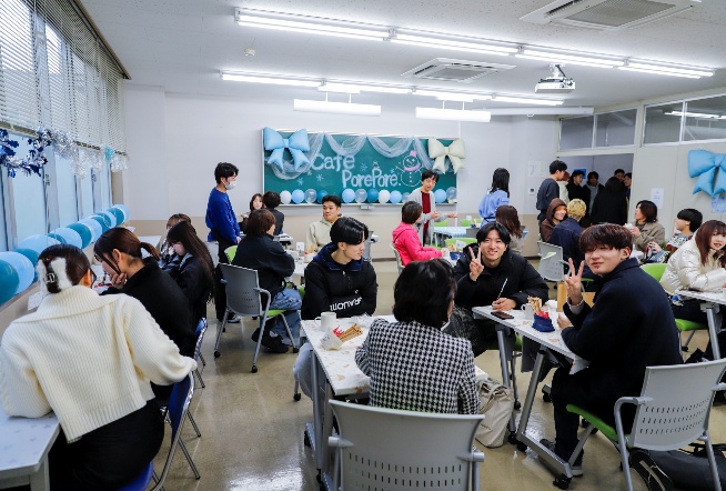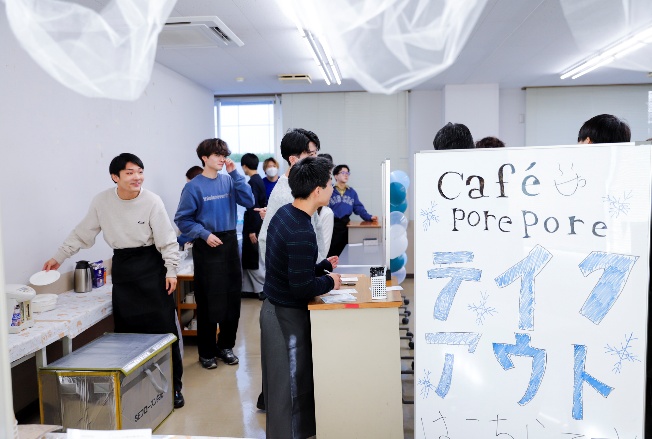 今年度のテーマは「寒い季節だからこそ、あたたかい時間を」。これまでの枠にとらわれないゼミ生独自のテーマを掲げ、企画から運営まで新たな挑戦を重ねました。その一つが、店内でくつろげるイートインと気軽に利用できるテイクアウトを組み合わせたハイブリッド型の運営です。当日は多くの学生・教職員が来場し、温かい飲み物やスイーツを手に、それぞれのスタイルでポレポレの時間を楽しむ姿が見られました。