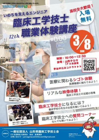 3月8日(日)に第12回臨床工学技士技士職業体験講座を山形テルサにて行われます。