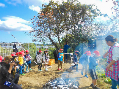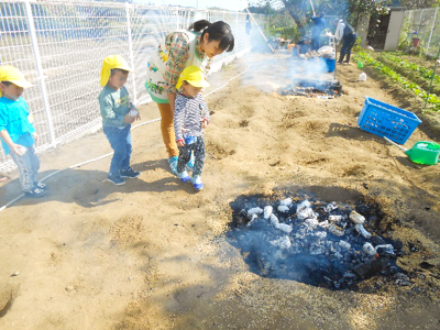 そして、お芋パーティでは、一人ひとり熱い焼き場にお芋を投入!