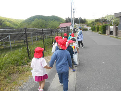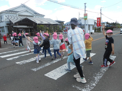 歩道がなくせまい道程ですが、交通ルールを守り横断歩道を渡ります。待ち時間が長いわりに、青信号の時間はほんの一瞬! 大急ぎで渡りました。中には、「バスで行きたいよ!」という子も数名・・・。