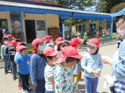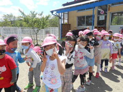 早速、年長の桜組・桃組が園を代表して、幼稚園のすぐそばにある「森の駅」さんに買い物に行きました。