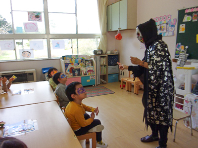 子どもたちがそれぞれに自分だけの仮面を作っておばけに変身しました。