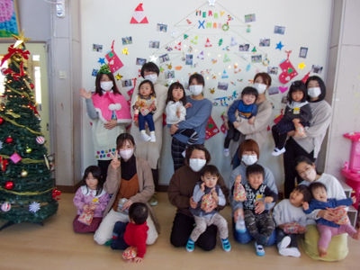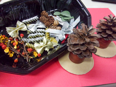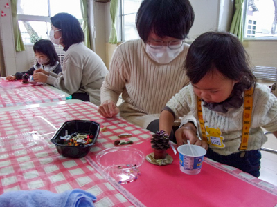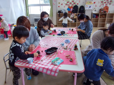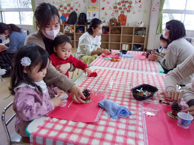 子育て支援「クリスマス会」では8組の親子が参加し、松ぼっくりツリー製作を楽しみました。