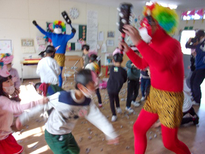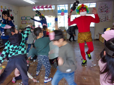 事前に、新聞紙を丸めて作った豆で鬼を退治する投球練習をして、いざ、鬼の登場を待ちます。