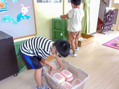給食の片付けをお願いすると「はい!分かりました!」と元気なお返事をして、片付けが終わっていないクラスから給食の入ったカゴを運んできてくれました。