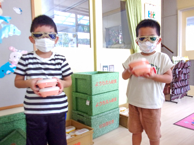 ピンクの容器は緑の箱へ、黄色の容器は茶色の箱へ。いつものように頑張る2人でしたが、、、、