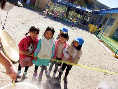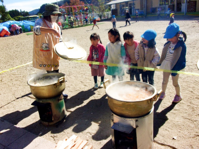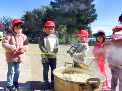 更に園庭では、簡易かまどで芋汁を煮ました。