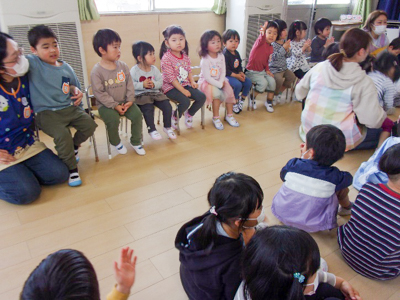 久々に、全園児が遊戯室に大集合!とても立派な姿勢で園長先生の話を聞いていた子ども達に感心しました!その後、入園したお友達が登場すると、「かわいい~!」とみんな拍手で迎えてくれました。先生達の長縄跳びを応援したり、友愛幼稚園の歌を聞き、会は終了。これから一緒に遊ぼうね!
