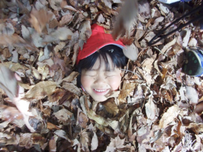 落ち葉を布団にしてにっこり笑顔!