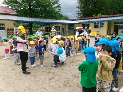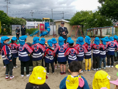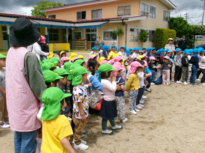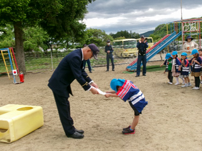 桜組さんが「ちかいのことば」を大きな声でとても立派に宣誓した後、熊ヶ根消防署の署長さんから任命証をいただき、「これからみんなは、消防士の仲間です。」と認めていただきました。