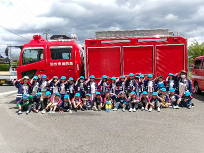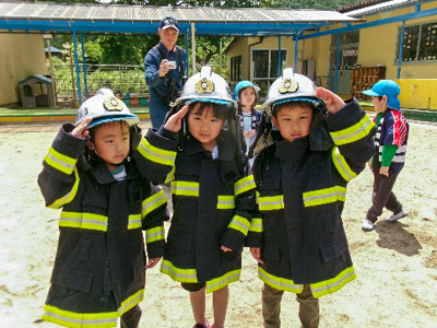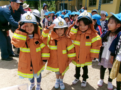 真剣に取り組んだ任命式の後は、桜組の全員で防火服を試着し、消防車を見せていただき、嬉しいご褒美がありました。