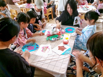 自分だけの可愛いうちわを作ります。スイカ、星、おさかな、好きな型を選んで、絵の具でペタペタ。キラキラシールも貼って、オリジナルのうちわが完成しました!記念撮影も、パチリ☆