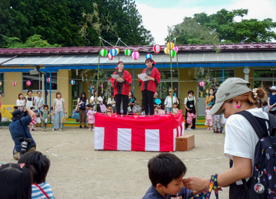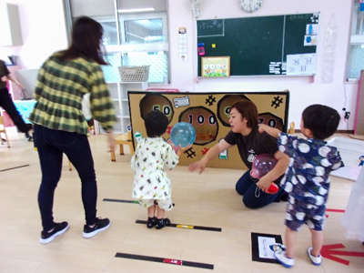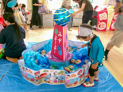 竹竿でぷかぷか浮かぶヨーヨーを釣ります。年長さんは難易度高めの長い竿を使って一生懸命頑張りました。可愛いヨーヨーをゲット!