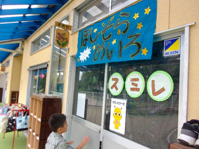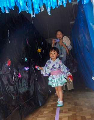 織姫と彦星の衣装を着た先生や運転手さんの写真を探しながら、迷路を歩きます。ライトで照らしながら暗い部屋を歩くのは、ワクワクして楽しかったね!