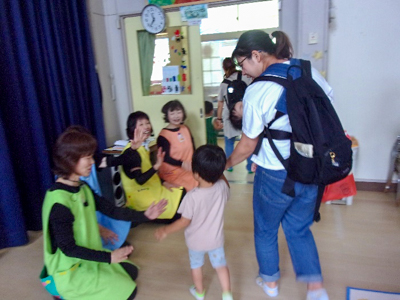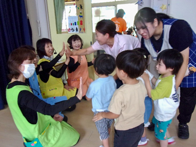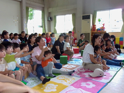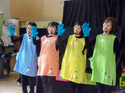 仙台市内の児童館等で活躍されている、SENDAI NPO 子育て応援隊ピンポンパン☆の皆さんによる、楽しいショーが行われました。急遽、満3歳つぼみ組と年中スミレ組も参加させていただき、賑やかで楽しい時間となりました。