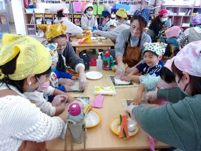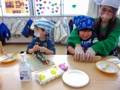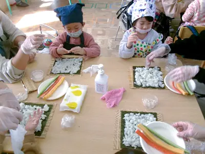 恵方巻の絵本を読んで、いざクッキング!今回は4種の具材を入れた、恵方巻です。海苔巻き作りには欠かせない「まきす」を初めて使う子も多かったようですが、各ご家庭で用意していただき、よいしょ!と頑張って巻いて上手に恵方巻が完成しました。