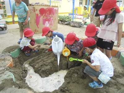 砂場では川づくりが始まりました!よく見たら・・・!?水を流す方法がじょうろを砂で固定して、ハンズフリーで水を流しています。