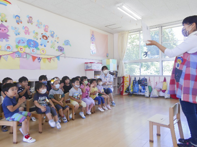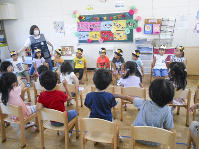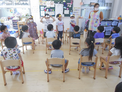 毎月行われるお誕生会。今年は4・5・6月のお友だちのお誕生会をやっと行うことができました。例年は遊戯室で全園児一斉に行うのですが、今年は密接を避けるためにクラス毎にお祝いします。